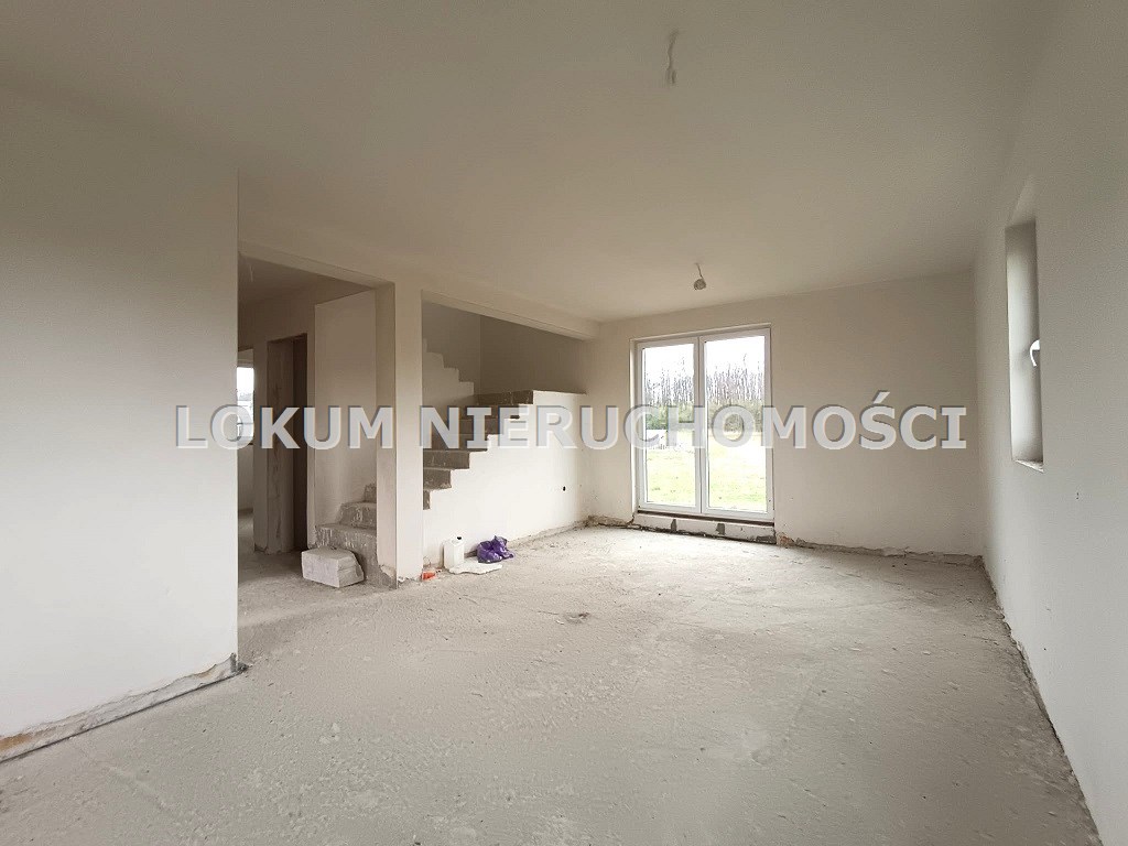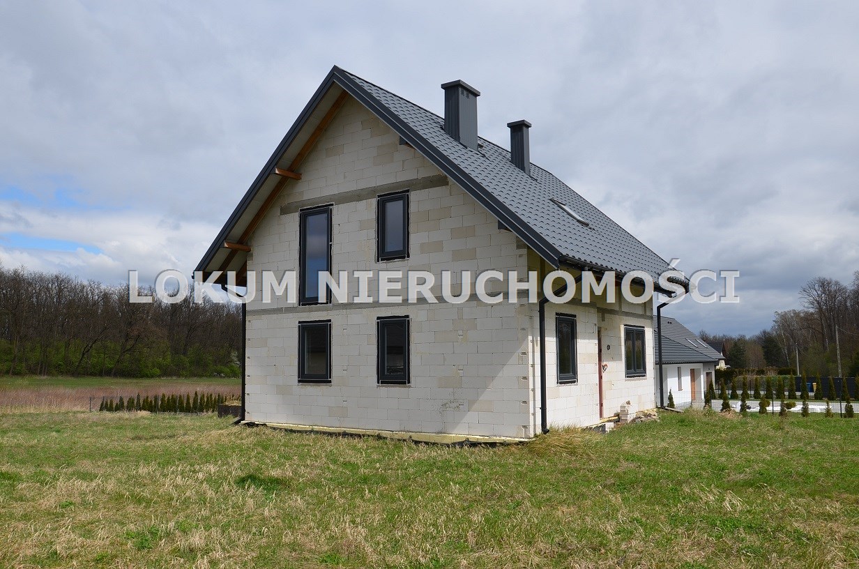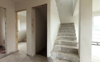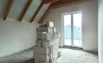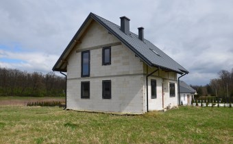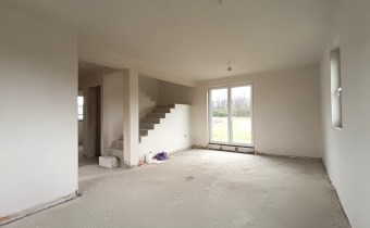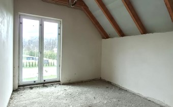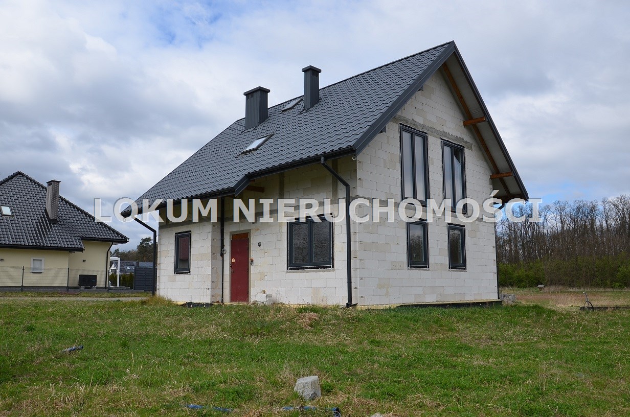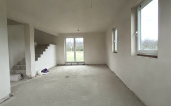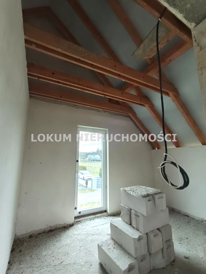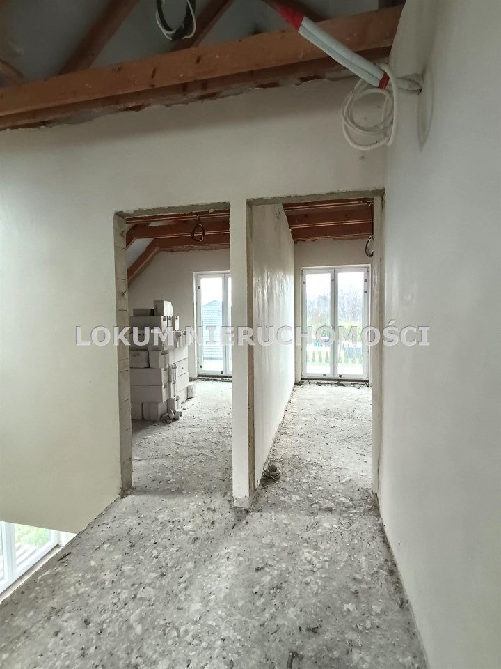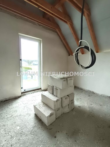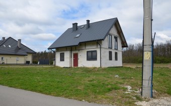 Materiał budowlany - bloczki YTONG. Dach dwuspadowy, kryty blachodachówką. Okna niemieckiej marki Kömmerling wykonane w technologii ciepłego montażu. Na podłogach wykonane zostały pierwsze wylewki. Na ścianach tynki. Wykonany przyłącz elektryczny i wodno-kanalizacyjny - rozprowadzone instalacje. Brak przyłącza gazu - wydane pozwolenie na jego wykonanie. Dojazd do nieruchomości odbywa się drogą asfaltową. Dodatkowo właściciel posiada udział w drodze wewnętrznej.