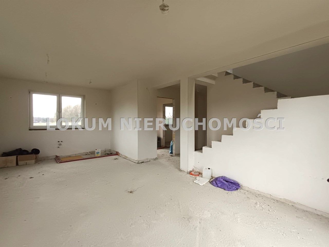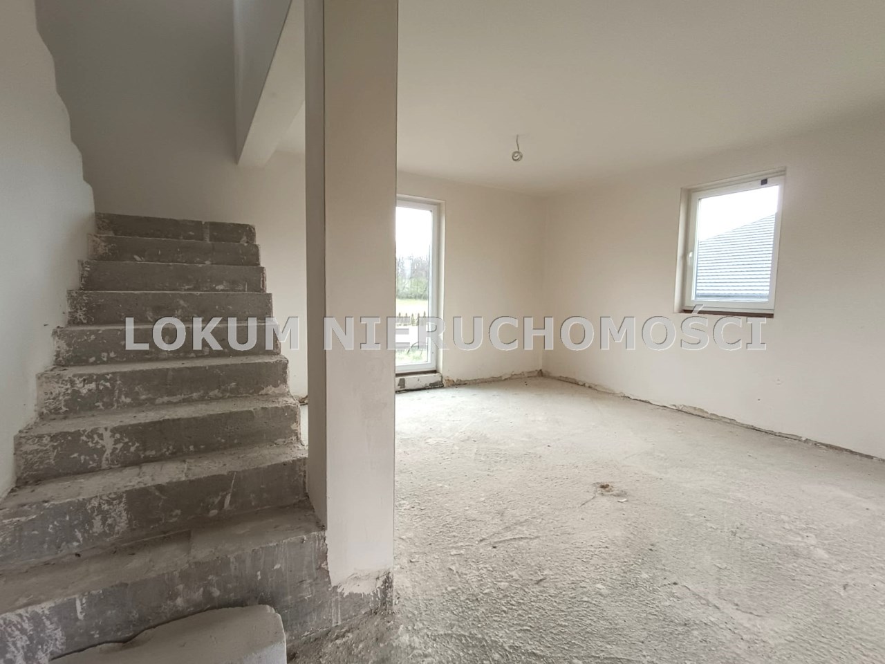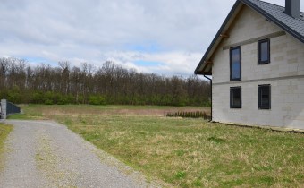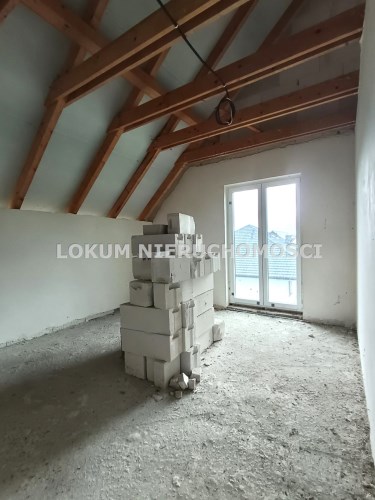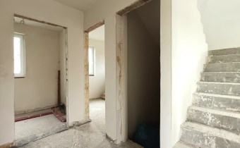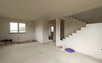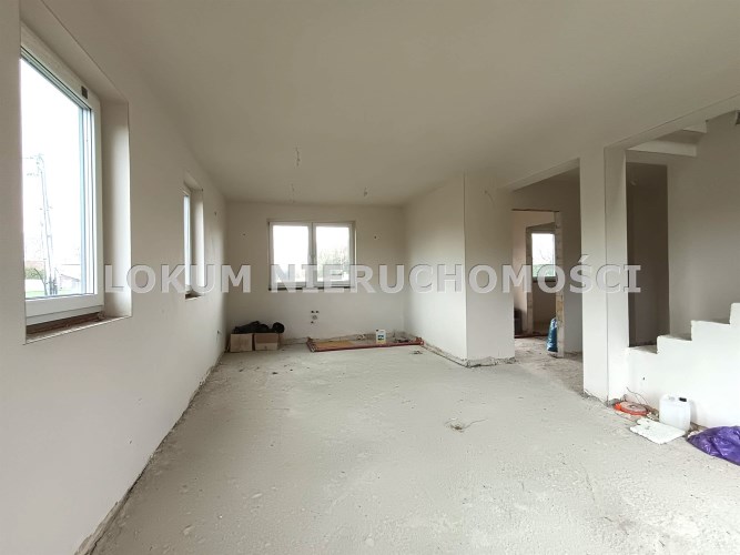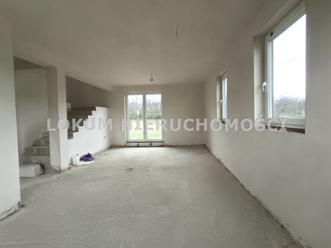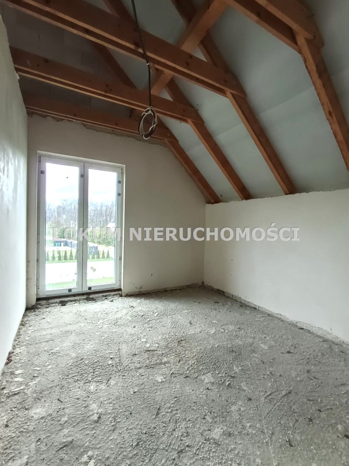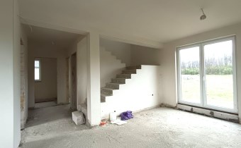 Materiał budowlany - bloczki YTONG. Dach dwuspadowy, kryty blachodachówką. Okna niemieckiej marki Kömmerling wykonane w technologii ciepłego montażu. Na podłogach wykonane zostały pierwsze wylewki. Na ścianach tynki. Wykonany przyłącz elektryczny i wodno-kanalizacyjny - rozprowadzone instalacje. Brak przyłącza gazu - wydane pozwolenie na jego wykonanie. Dojazd do nieruchomości odbywa się drogą asfaltową. Dodatkowo właściciel posiada udział w drodze wewnętrznej.