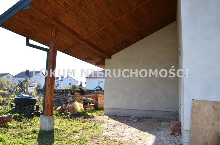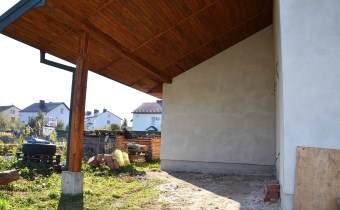 Budynek jest w stanie deweloperskim, budowa rozpoczęta w 2013r. - wykonane zostały tynki, wylewki oraz wszystkie instalacje: elektryczna, wodno-kanalizacyjna i grzewcza. Wnętrze jest przygotowane do wykończenia według własnego gustu i potrzeb. Dach kryty blachodachówką. Materiał budowlany: pustak MAX, ściany dwudziałowe (dwa pustaki), wewnątrz docieplenie - wełna mineralna 10cm. Okna PCV. Drzwi zewnętrzne metalowe. Podbitka drewniana wykonana w październiku tego roku.
