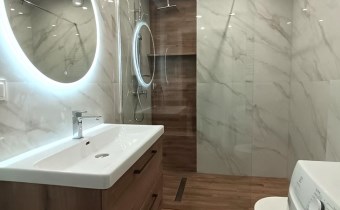 • W łazience z WC: prysznic, umywalka, szafka, pralka.