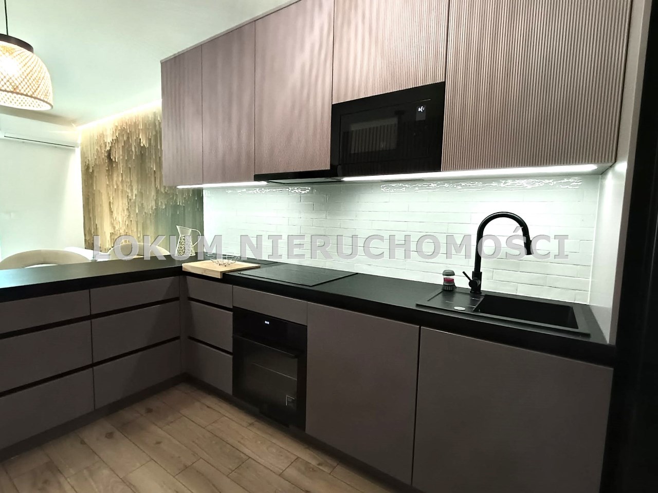 Kuchnia wykonana została w zabudowie i wyposażona w nowoczesny sprzęt AGD, w tym lodówkę, płytę indukcyjną, piekarnik elektryczny, zmywarkę oraz mikrofalówkę, co pozwala na pełną funkcjonalność już od pierwszego dnia. W sypialni znajduje się wygodne łóżko dwuosobowe oraz pojemna szafa w zabudowie na całą ścianę. Łazienka jest w pełni wyposażona, w tym w pralkę.